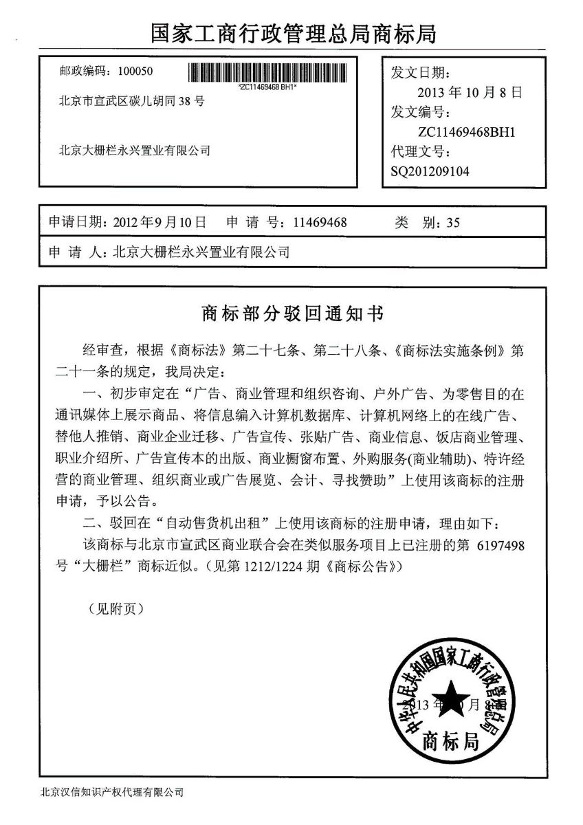 在永興置業(yè)申請的35類注冊“大柵欄圖形”商標(biāo)中除“自動售貨機(jī)出租”這一項(xiàng)駁回,其余20項(xiàng)(1、廣告;2、廣告宣傳;3、計(jì)算機(jī)網(wǎng)絡(luò)上的在線廣告;4、戶外廣告;5、廣告宣傳本的出版;6、商業(yè)櫥窗布置;7、為零售目的在通訊媒體上展示商品;8、張貼廣告;9、商業(yè)信息;10、組織商業(yè)或廣告展覽;11、飯店商業(yè)管理;12、外購服務(wù)(商業(yè)輔助);13、商業(yè)管理和組織咨詢;14、特許經(jīng)營的商業(yè)管理;15、替他人推銷;16、職業(yè)介紹所;17、商業(yè)企業(yè)遷移;18、將信息編入計(jì)算機(jī)數(shù)據(jù)庫;19、會計(jì);21、尋找贊助)已經(jīng)通過初審。