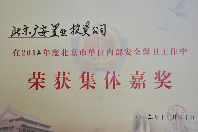 2013年1月10日,經首都綜合治理辦公室和北京市公安局批準,北京廣安置業(yè)投資公司被授予“2012年度北京市單位內部安全保衛(wèi)集體嘉獎”榮譽稱號。此稱號是北京市公安局對廣安置業(yè)在2012年度認真落實治安保衛(wèi)工作制度,并在治安保衛(wèi)工作中取得顯著成績的肯定和表揚。