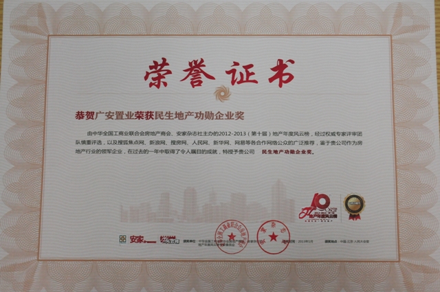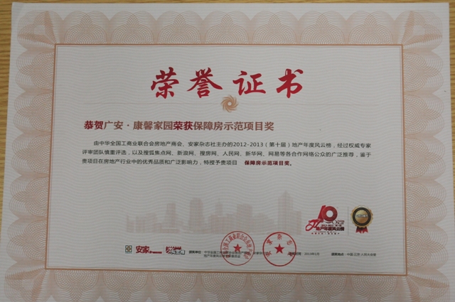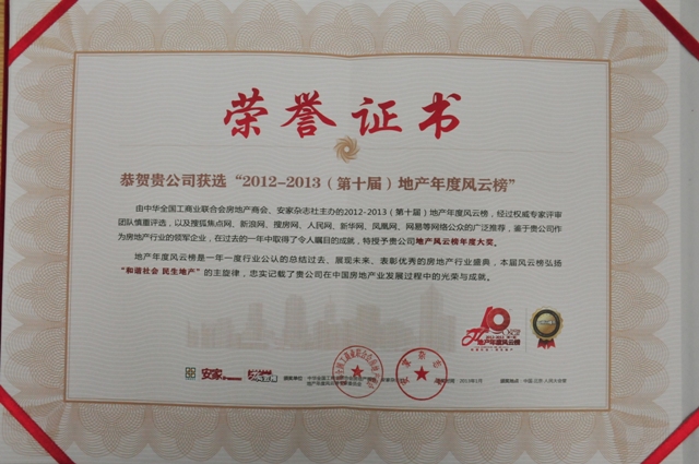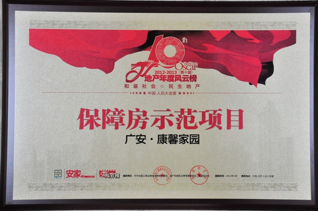 2013年1月18日,從全國(guó)工商聯(lián)房地產(chǎn)商會(huì)主辦的中國(guó)房地產(chǎn)業(yè)“2012-2013地產(chǎn)年度風(fēng)云榜”頒獎(jiǎng)盛會(huì)上傳來喜訊,北京廣安置業(yè)投資公司及廣安·康馨家園項(xiàng)目雙雙入選“2012-2013(第十屆)地產(chǎn)年度風(fēng)云榜”,置業(yè)公司喜獲2012-2013“民生地產(chǎn)功勛企業(yè)”、廣安·康馨家園項(xiàng)目獲得2012-2013“保障房示范項(xiàng)目”榮譽(yù)稱號(hào),這是置業(yè)公司在2012年度所獲得的又一大獎(jiǎng),也是對(duì)公司及全體員工一年來的辛勤工作的肯定和鼓舞。此次盛會(huì)已經(jīng)引起了國(guó)內(nèi)房地產(chǎn)行業(yè)眾多公司及知名行業(yè)人士的關(guān)注和參與,全國(guó)300多家媒體對(duì)此次盛會(huì)進(jìn)行了跟蹤報(bào)道。